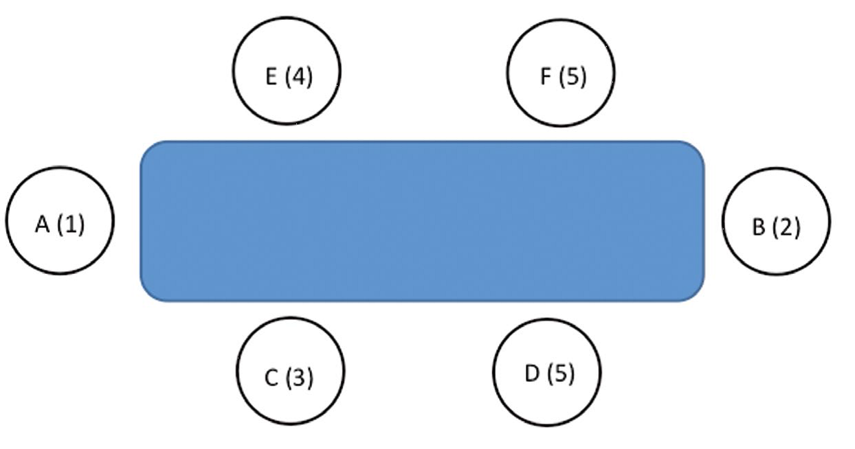 Bordplassering. Tallene viser rangorden eller status, D og F deler femteplassen.